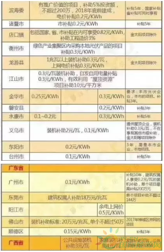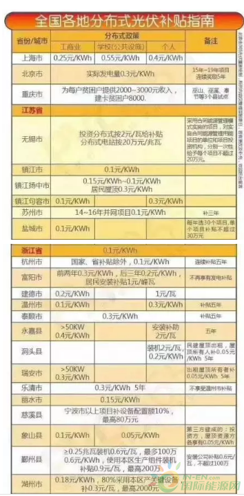 隨著分布式光伏發(fā)電的大力推廣,在屋頂安裝光伏已然成為一種潮流。當然,安裝光伏是一筆不小的投資,為此,國家對光伏進行了補貼。以下圖片便是全國各地光伏補貼的具體情況。