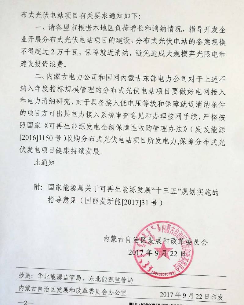 9月22日,內(nèi)蒙古發(fā)改委發(fā)布《關(guān)于我區(qū)分布式光伏電站有關(guān)事宜的通知》要求分布式光伏電站的備案規(guī)模不得超過2萬千瓦,同時要求電網(wǎng)公司對不限規(guī)模指標(biāo)的分布式光伏電站做好電力消納研究和電網(wǎng)接入,保障分布式光