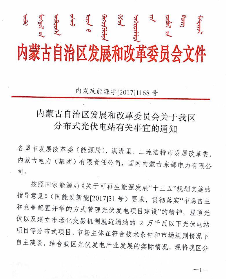 內(nèi)蒙古發(fā)改委:分布式光伏不得超過20MW 保障分布式電力消納