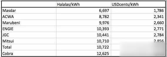 沙特阿拉伯北部Al Jouf省Sasaka 300兆瓦光伏項(xiàng)目競標(biāo)結(jié)果10月3日揭曉:阿布達(dá)比Future Energy Co (Masdar)和法國EDF Energies Nouvelles聯(lián)合報(bào)價(jià),平準(zhǔn)成本為1.786美分/千瓦時(shí),創(chuàng)光伏報(bào)價(jià)最低紀(jì)錄。沙特阿拉伯Acwa Power公司報(bào)出2.341美分/千瓦時(shí),排在第2位;其他公司報(bào)價(jià)見下表。