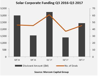 這些變化發(fā)生在全球太陽(yáng)能相對(duì)強(qiáng)勁的時(shí)期。在2017年第三季度的報(bào)告中,Mercom發(fā)現(xiàn),在第三季度穩(wěn)定的情況下,2017年前九個(gè)月的企業(yè)資金總額達(dá)到了71億美元,僅比去年同期下降了5%。但該公司報(bào)告說(shuō),這主要是由于其他國(guó)家的收益,因?yàn)槊绹?guó)公司的債務(wù)融資從第二季度的24億美元下降到僅5億美元。
