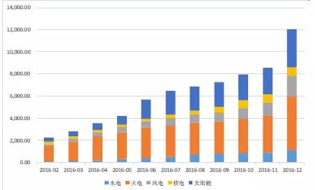 2016年2月-2016年12月中國(guó)發(fā)電新增設(shè)備容量(單位:萬(wàn)kWh)