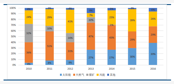 2010-2016美國(guó)發(fā)電新增設(shè)備容量占比情況(單位:%)