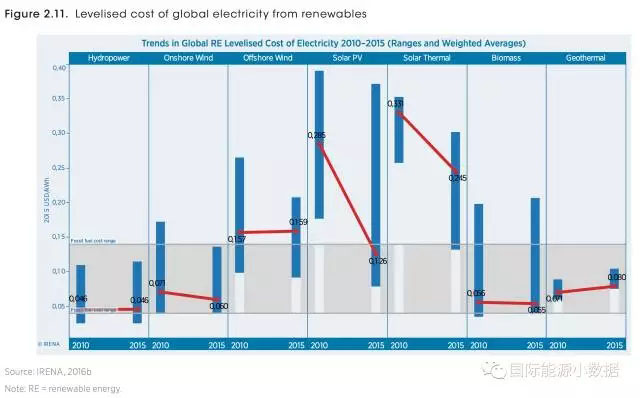 根據(jù)國際可再生能源署的數(shù)據(jù),2010-2015年各類可再生能源全生命周期平準成本(美元/千瓦時)走向如下: