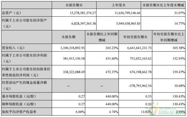 2017年10月28日,陽光電源股份有限公司發(fā)布2017 年第三季度報告。報告顯示,三季度陽光電源營業(yè)收入31億元,比上年同期增長265.23%,歸屬于上市公司股東的凈利潤為3.82億元,比上年同期增長431.60%;2017年1-9月,陽光電源營業(yè)收入66.42億元,比上年同期增長105.58%,歸屬于上市公司股東的凈利潤為7.51億元,比上年同期增長152.93%。截止2017年9月,陽光電源總資產為152.79億元,比上年度末增長31.07%,歸屬于上市公司股東的凈資產為68.28億元,比上年度末增長14.77%。