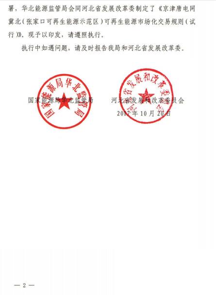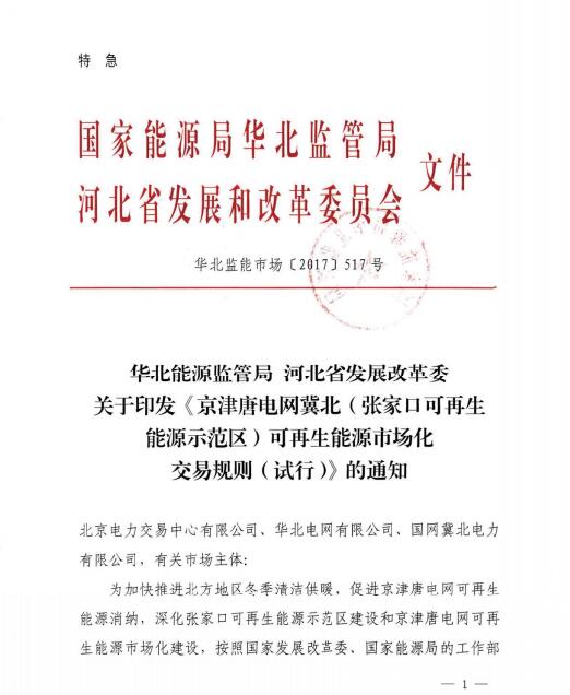 關(guān)于印發(fā)《京津唐電網(wǎng)冀北(張家口可再生能源示范區(qū))可再生能源市場(chǎng)化交易規(guī)則(試行)》的通知(華北監(jiān)能市場(chǎng)【2017】517號(hào))