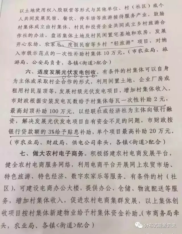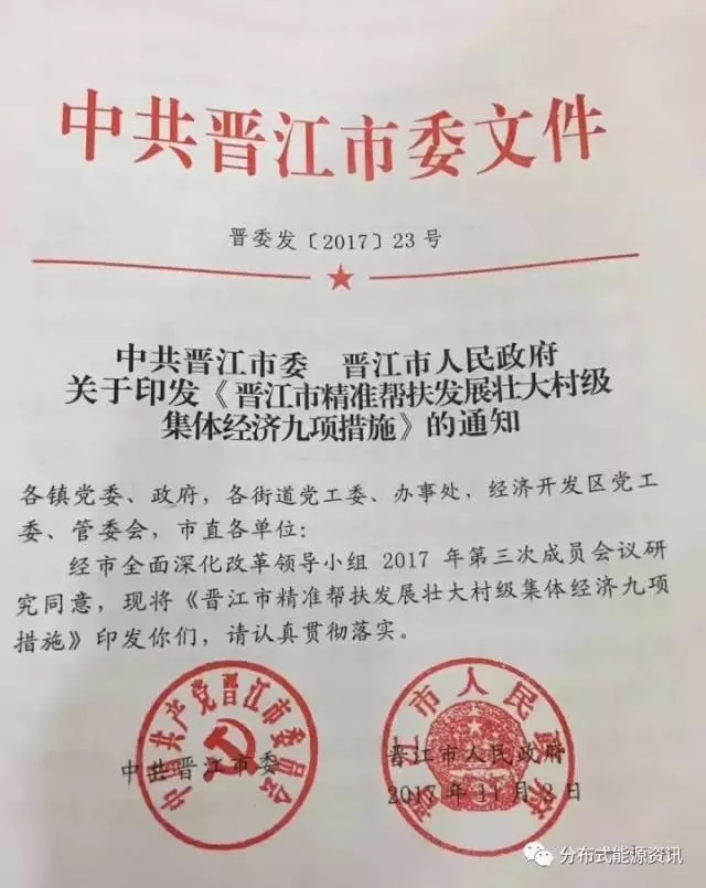 近日,福建省晉江市委、市政府聯(lián)合發(fā)布《晉江市精準(zhǔn)幫扶發(fā)展壯大村級集體經(jīng)濟(jì)九項措施》的文件,對晉江市光伏發(fā)電實(shí)行補(bǔ)助,村級光伏項目一次性補(bǔ)助2元/瓦,對于貸款部分,市級財政給予3%的貼息補(bǔ)助。