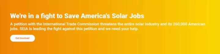 圖片內(nèi)容:為了挽救美國太陽能行業(yè),我們正在奮斗。這份提請威脅到美國太陽能行業(yè)26萬個工作機會,太陽能行業(yè)協(xié)會正奮力反對,我們需要你的幫助。