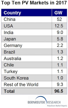 Bernreuter Research得到85個國家自下而上的光伏需求評估的支持,預(yù)計2017年全球安裝量為96.5GW,比2016年的超過74GW增長30%。另一個指標(biāo)是同樣的方向:通過從四大模塊供應(yīng)商晶科,阿特斯,晶澳太陽能和韓華Q電池的總體出貨指導(dǎo)中推算出全球需求,貝納特勒研究在2017年得出了類似的結(jié)果。
