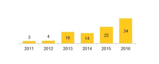 在34GW的總裝機量中,中國的新增光伏容量占27GW,增幅遠(yuǎn)超世界任何其他國家。不過,中國以外的其他發(fā)展中國家的光伏裝機也出現(xiàn)了強勁增長,印度的新增裝機達(dá)4.2GW。與此同時,2016年,巴西、智利、約旦、墨西哥、巴基斯坦及其他9個國家的累積光伏容量均增加了1倍以上??偟膩碚f,2016年,光伏在Climatescope研究國家新增發(fā)電裝機中的比例為19%,較2015年的10.6%和2011年的2%有所提高。