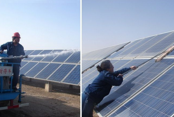 人工干洗組件:人工干洗是采用長(zhǎng)柄絨拖布配合專用洗塵劑進(jìn)行清洗,使用的油性靜電吸塵劑。主要利用靜電吸附原理,具有吸附灰塵和沙粒的作用,能夠增強(qiáng)清洗工具吸塵去污能力,有效地避免在清掃時(shí)的灰塵沙粒飛揚(yáng)。由于完全依靠人力,存在表面殘留物較多、組件由受力不均可能產(chǎn)生變形隱裂的問題。壓縮空氣吹掃是通過專用裝置吹出壓縮空氣清除組件表面的灰塵,用于水資源匱乏的地區(qū)。這種方式效率低,且存在灰塵高速摩擦組件的問題,目前很少有電站使用。