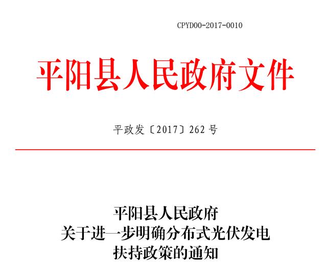 浙江平陽(yáng)縣人民政府發(fā)布《關(guān)于進(jìn)一步明確分布式光伏發(fā)電扶持政策的通知》,詳細(xì)政策文件如下。