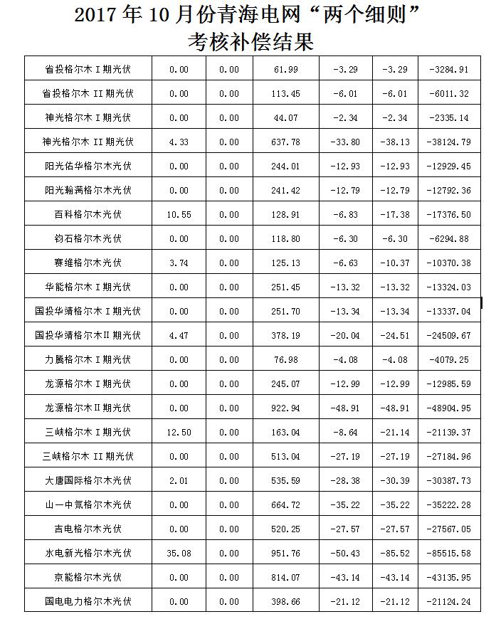 2017年10月份青海電網(wǎng)“兩個(gè)細(xì)則”考核補(bǔ)償情況的通知(光伏)