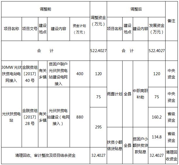 經(jīng)縣脫貧攻堅領(lǐng)導(dǎo)小組研究,決定調(diào)整《金寨縣2017年第二批財政專項(xiàng)扶貧資金項(xiàng)目計劃》中“光伏扶貧電站”項(xiàng)目計劃、《金寨縣2017年第三批財政專項(xiàng)扶貧資金項(xiàng)目計劃》中“30MW光伏扶貧電站電網(wǎng)接入”項(xiàng)目計劃及重新安排清理回收資金項(xiàng)目計劃(詳見附表)。