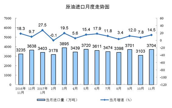 原油進(jìn)口增速加快。11月份,進(jìn)口原油3704萬噸,同比增長14.5%,增速比10月份加快6.7個百分點。1-11月份,進(jìn)口原油3.9億噸,同比增長12.0%。