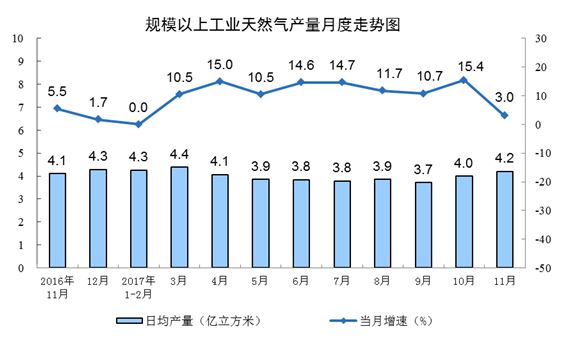天然氣生產(chǎn)繼續(xù)增長,但增速有所回落。11月份,天然氣產(chǎn)量126.3億立方米,同比增長3.0%,受同期基數(shù)較高影響,增速比10月份回落12.4個百分點;日均生產(chǎn)4.2億立方米,同比增加0.1億立方米。1-11月份,天然氣產(chǎn)量1338.1億立方米,同比增長9.1%。