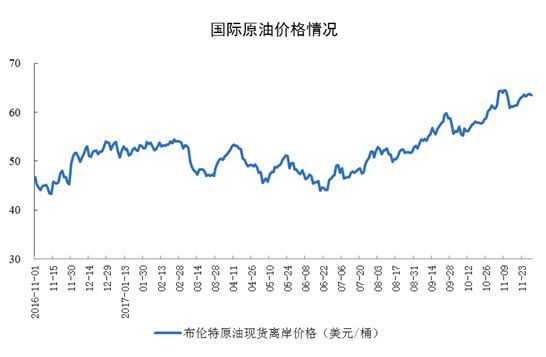 原油價格持續(xù)回升。11月份,布倫特原油現(xiàn)貨離岸價格穩(wěn)定在60美元/桶以上。截至11月30日,價格為63.5美元/桶,比10月底上漲2.2美元/桶。