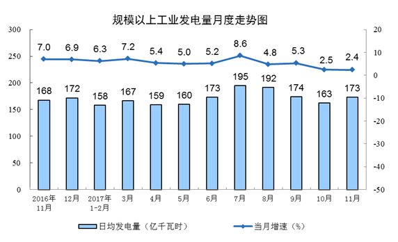 11月份,發(fā)電量5196.3億千瓦時,同比增長2.4%,增速比10月份回落0.1個百分點。受降水情況影響(11月份全國平均降水量15.9毫米,比去年同期減少14.8毫米),水電增速回落,11月份同比增長8.7%,增速比10月份回落8.2個百分點;因煤炭減量替代的推進(jìn),火電持續(xù)負(fù)增長,11月份同比下降1.4%,降幅比10月份收窄1.4個百分點。