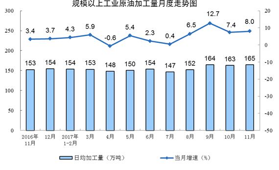 原油加工量增速略有加快。受成品油市場需求和價格上漲等因素影響,原油加工量保持較快增長,11月份同比增長8.0%,增速比10月份加快0.6個百分點;日均加工量164.8萬噸,同比增加12.2萬噸。主要成品油產(chǎn)量均保持正增長,汽油、煤油和柴油同比分別增長7.7%、3.7%和3.5%。1-11月份,原油加工量5.2億噸,同比增長5.2%。