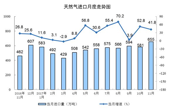 天然氣進(jìn)口快速增長。11月份,進(jìn)口天然氣655萬噸,同比增長41.8%,增速比10月份放緩11.0個百分點。1-11月份,進(jìn)口天然氣6070萬噸,同比增長26.5%。
