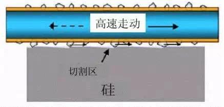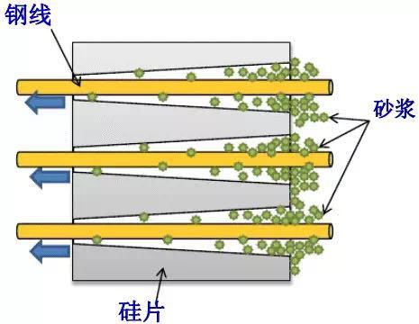 金剛線切割和砂漿切割的基本區(qū)別在于,金剛線切割是切削加工,即將金剛石采用粘接和電鍍的方式固定在直拉鋼線上進(jìn)行高速往返切削,而砂漿切割是“滾動(dòng)-嵌入”切割,靠懸浮液的懸浮碳化硅通過線網(wǎng)的帶動(dòng),進(jìn)行磨削切割。
