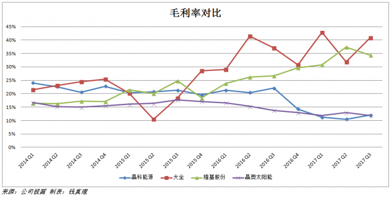 我們可以很明顯的看到,2017年隆基和大全的整體毛利率都維持在30%以上,而晶科與晶澳的毛利率都在15%以下,這就使得今年隆基一家公司的利潤(rùn)(約30億)會(huì)等于所有下游組件企業(yè)的利潤(rùn)總和(約10億)的3倍,這也意味著整個(gè)光伏行業(yè)的利潤(rùn)都在上游企業(yè)。