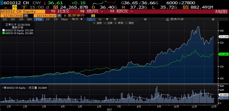 如果我們?nèi)タ凑麄€(gè)A股光伏板塊的龍頭,隆基股份,其漲幅是超過(guò)貴州茅臺(tái)在2017年的漲幅(2017年,隆基最高漲幅223%,貴州茅臺(tái)最高漲幅120%)。