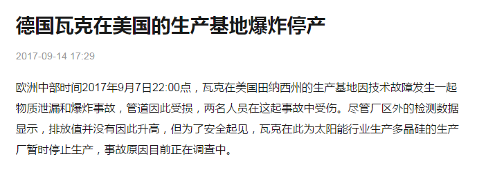 上游的漲價(jià)疊加了兩個(gè)因素,一個(gè)是2017年的光伏整體需求超預(yù)期,另一個(gè)是瓦克工廠意外的爆炸,帶來(lái)的2萬(wàn)噸的停產(chǎn):