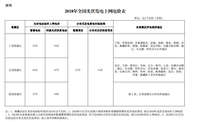 國家發(fā)展改革委下發(fā)《關(guān)于2018年光伏發(fā)電項(xiàng)目價(jià)格政策的通知》,要求降低2018年1月1日之后投運(yùn)的光伏電站標(biāo)桿上網(wǎng)電價(jià),Ⅰ類、Ⅱ類、Ⅲ類資源區(qū)標(biāo)桿上網(wǎng)電價(jià)分別調(diào)整為每千瓦時(shí)0.55元、0.65元、0.75元(含稅);村級光伏扶貧電站上網(wǎng)電價(jià)分別為0.65元、0.75元、0.85元;通知規(guī)定,2018年1月1日以后投運(yùn)的、采用“自發(fā)自用、余量上網(wǎng)”模式的分布式光伏發(fā)電項(xiàng)目,全電量度電補(bǔ)貼標(biāo)準(zhǔn)降低0.05元,即補(bǔ)貼標(biāo)準(zhǔn)調(diào)整為每千瓦時(shí)0.37元(含稅)。采用“全額上網(wǎng)”模式的分布式光伏發(fā)電項(xiàng)目按所在資源區(qū)光伏電站價(jià)格執(zhí)行。