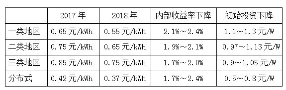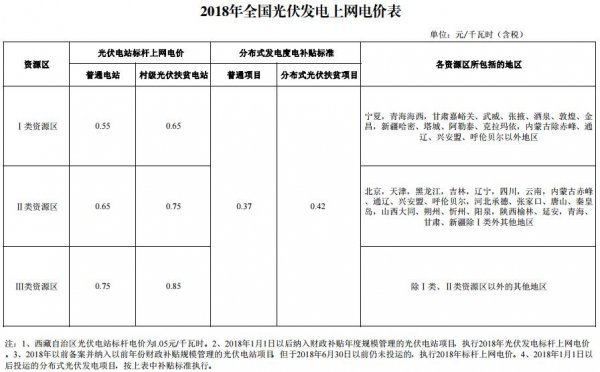 國家發(fā)展改革委于2017年12月22號下發(fā)《關(guān)于2018年光伏發(fā)電項目價格政策的通知》,要求降低2018年1月1日之后投運的光伏電站標(biāo)桿上網(wǎng)電價,Ⅰ類、Ⅱ類、Ⅲ類資源區(qū)標(biāo)桿上網(wǎng)電價分別調(diào)整為每千瓦時0.55元、0.65元、0.75元(含稅);村級光伏扶貧電站上網(wǎng)電價分別為0.65元、0.75元、0.85元;通知規(guī)定,2018年1月1日以后投運的、采用“自發(fā)自用、余量上網(wǎng)”模式的分布式光伏發(fā)電項目,全電量度電補貼標(biāo)準(zhǔn)降低0.05元,即補貼標(biāo)準(zhǔn)調(diào)整為每千瓦時0.37元(含稅)。采用“全額上網(wǎng)”模式的分布式光伏發(fā)電項目按所在資源區(qū)光伏電站價格執(zhí)行。