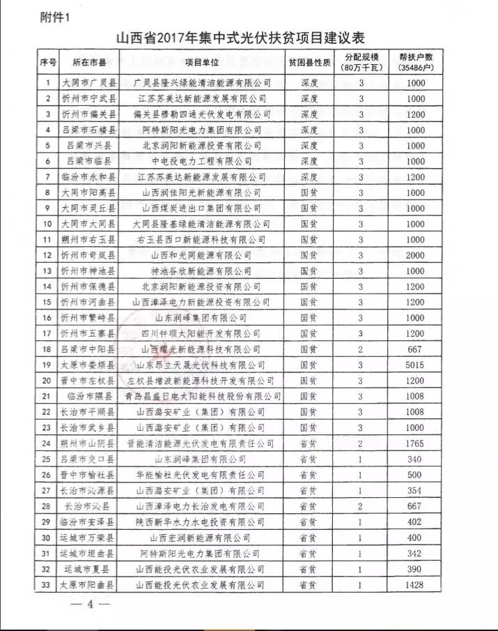 山西2017年800MW集中式光伏扶貧指標(biāo)分配項(xiàng)目名單