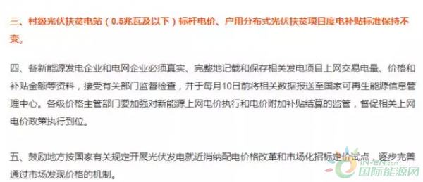 村級(jí)光伏扶貧電站(0.5兆瓦及以下)標(biāo)桿電價(jià)、戶用分布式光伏扶貧項(xiàng)目度電補(bǔ)貼標(biāo)準(zhǔn)保持不變。意思就是:0.5MW及以下村級(jí)扶貧電站標(biāo)桿電價(jià)繼續(xù)執(zhí)行2017年電價(jià)。戶用分布式光伏扶貧項(xiàng)目繼續(xù)執(zhí)行2017年電價(jià)。