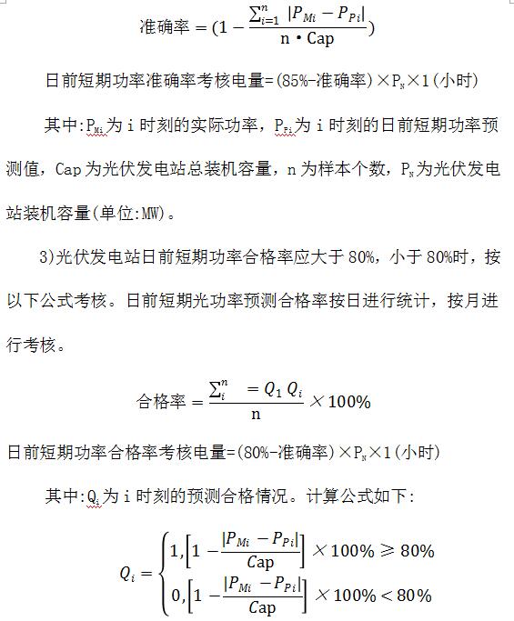 2)光伏發(fā)電站日前短期功率預(yù)測(cè)準(zhǔn)確率應(yīng)大于等于85%,小于85%時(shí),按以下公式考核。日前短期功率預(yù)測(cè)準(zhǔn)確率按日進(jìn)行統(tǒng)計(jì),按月進(jìn)行考核。