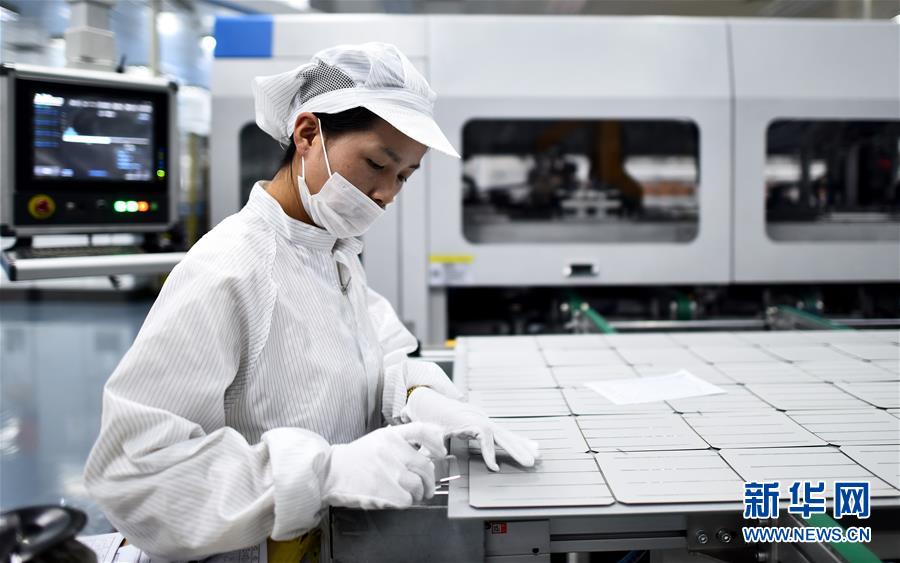 12月28日,在青海西寧,黃河水電太陽能電力公司一名工作人員將單晶PERC電池塊放入生產(chǎn)設(shè)備內(nèi)。