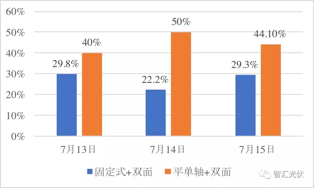 雙面組件如果能跟跟蹤式相結(jié)合的話會產(chǎn)生1+1>2的效果。下面張圖就是一個企業(yè)的數(shù)據(jù),根據(jù)他們的計算在七月份期間我們平單軸加雙面大概能提高百分之四十以上的發(fā)電量。
