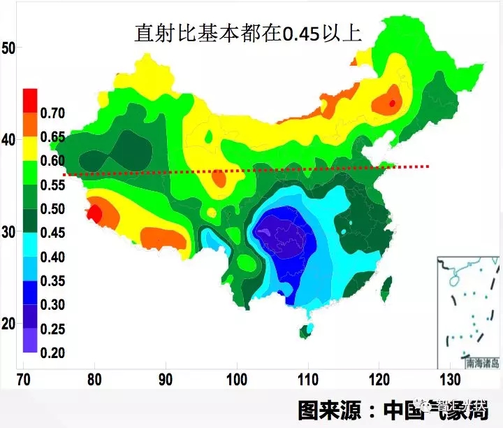 從中國氣象局公布的這張圖上來看,就是剛才說三十六點五度附近他的直射比非常理想。在這種緯度分布疊加雙面跟蹤軸技術(shù)對發(fā)電量提升效果是非常顯著的。