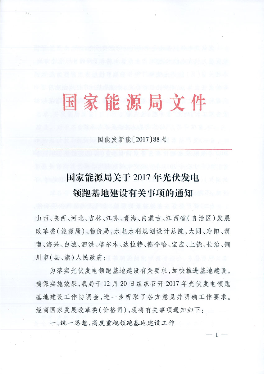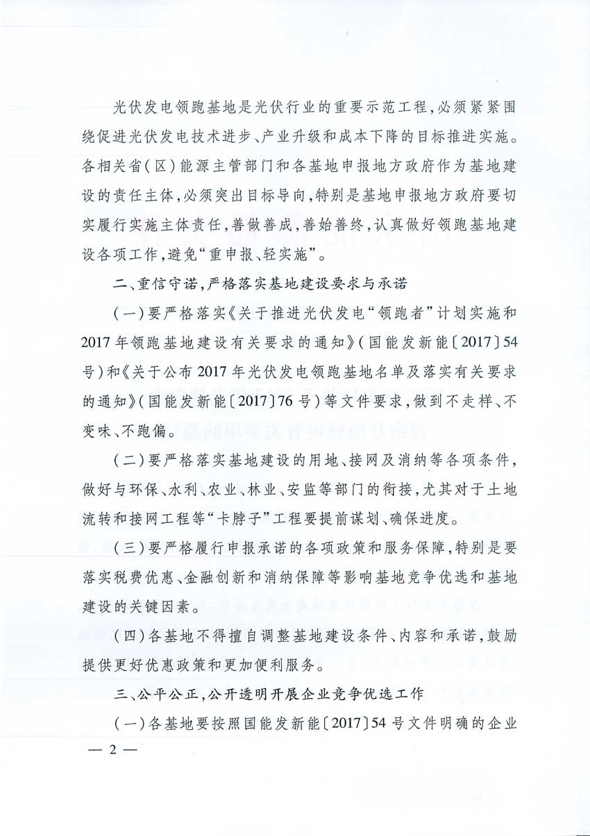 國(guó)家能源局關(guān)于2017年光伏發(fā)電領(lǐng)跑基地建設(shè)有關(guān)事項(xiàng)的通知