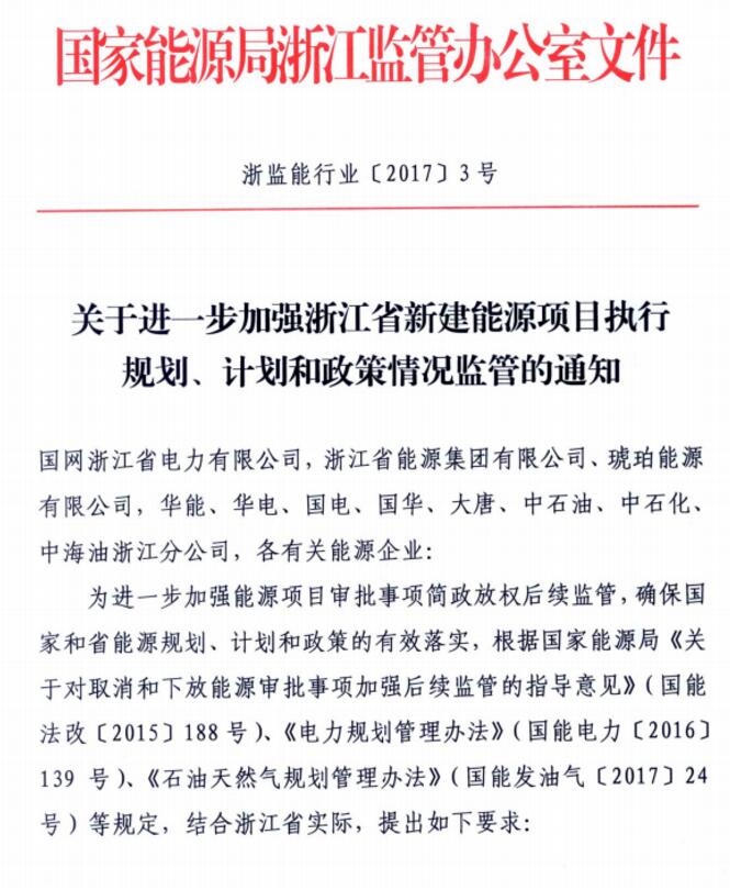1月9日,國家能源局浙江監(jiān)管辦公開發(fā)布《關于進一步加強浙江省新建能源項目執(zhí)行規(guī)劃、計劃和政策情況監(jiān)管的通知》,《通知》要求,浙江省新