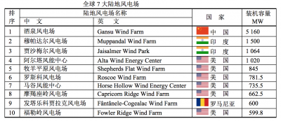 世界上最大的陸地風(fēng)電場是中國甘肅酒泉風(fēng)電基地(Gansu Wind Farm),2009年開始建造,額定裝機(jī)容量7965MW,最終計(jì)劃20000MW。年發(fā)電量90000GWh。