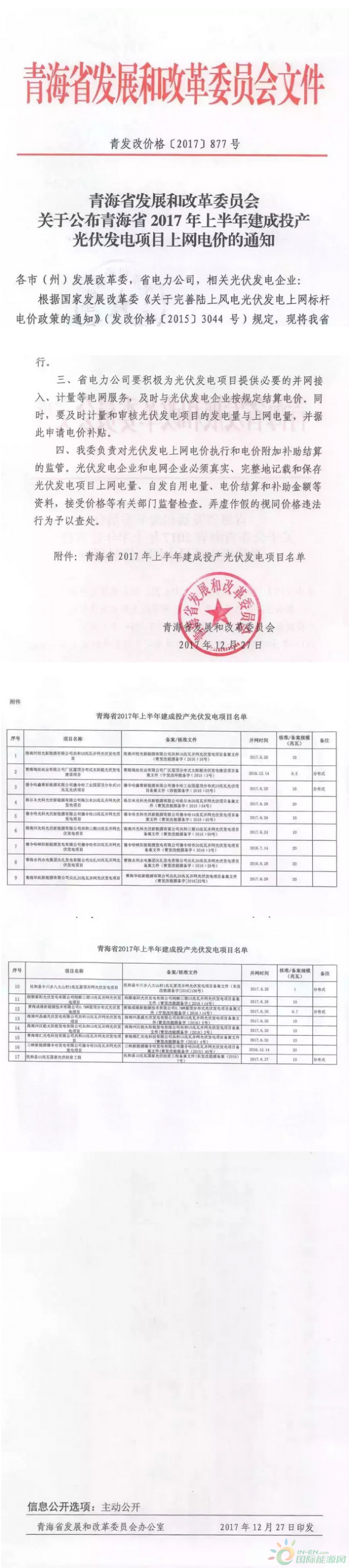 日前,青海省發(fā)改委發(fā)布《關(guān)于公布青海省2017年上半年建成投產(chǎn)光伏發(fā)電項(xiàng)目上網(wǎng)電價(jià)的通知》。2017年上半年,青海省共有17個(gè)光伏項(xiàng)