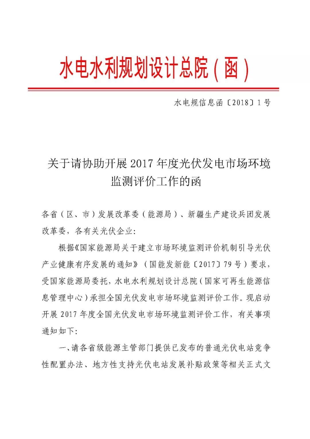 1月12日,水電水利規(guī)劃設計總院網(wǎng)站對外發(fā)布了《關(guān)于請協(xié)助開展2017年度光伏發(fā)電市場環(huán)境監(jiān)測評價工作的函》,啟動開展 2017 年度全