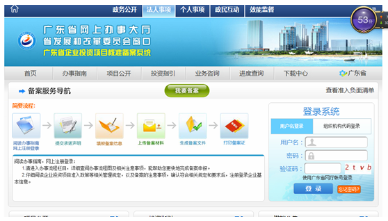 企業(yè)自行登錄廣東省企業(yè)投資項(xiàng)目備案系統(tǒng)如下圖(http://www.gdtz.gov.cn/index.action),點(diǎn)擊“我要備案”按照網(wǎng)站流程填寫項(xiàng)目?jī)?nèi)容即可生成賬號(hào),之后登錄賬戶完成分布式光伏項(xiàng)目備案,其中項(xiàng)目行業(yè)代碼為“4415太陽(yáng)能發(fā)電”。