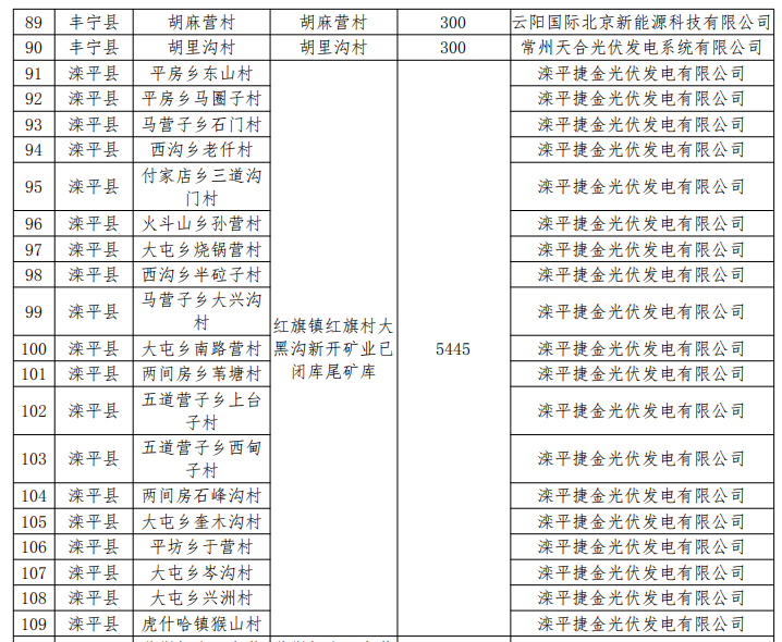 四、同意隆化縣村級(jí)光伏扶貧電站建設(shè)企業(yè)由河北華通科技股份有限公司和常州天合光伏發(fā)電系統(tǒng)有限公司變更為全部由河北華通科技股份有限公司1家企業(yè)建設(shè)。同意隆化鎮(zhèn)十二撓海村、張三營(yíng)鎮(zhèn)寶山村、郭家屯鎮(zhèn)二道營(yíng)村、藍(lán)旗鎮(zhèn)北溝村、唐三營(yíng)鎮(zhèn)太平村、湯頭溝鎮(zhèn)鳳凰嶺村、中關(guān)鎮(zhèn)北鋪?zhàn)哟濉㈨n麻營(yíng)鎮(zhèn)京堂溝村、步古溝鎮(zhèn)東阿超村、韓家店鄉(xiāng)老窩鋪村、舊屯鄉(xiāng)西屯村、尹家營(yíng)鄉(xiāng)混鐵溝村、章吉營(yíng)鄉(xiāng)東北溝村、白虎溝鄉(xiāng)泉眼溝村、八達(dá)營(yíng)鄉(xiāng)白云山村、太平莊鄉(xiāng)馬柵子村、堿房鄉(xiāng)燕子窩村、偏坡?tīng)I(yíng)鄉(xiāng)山咀村、灣溝門(mén)鄉(xiāng)大西臺(tái)村、荒地鄉(xiāng)茅吉口村等20村聯(lián)建,分村備案,建設(shè)地點(diǎn)變更為韓麻營(yíng)鎮(zhèn)官地村國(guó)利尾礦庫(kù),裝機(jī)規(guī)模6000千瓦。