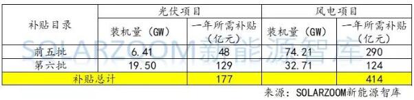 進入前六批可再生能源補貼目錄的電站項目中,風(fēng)力發(fā)電項目和光伏發(fā)電項目裝機量占比超過95%,因此記者在可再生能源補貼測算中不涵蓋生物質(zhì)能和地?zé)崮艿妊a貼測算。經(jīng)測算,目前涵蓋在以發(fā)放的前六批可再生能源補貼目錄中,光伏項目每年所需要的補貼為177億元,風(fēng)電每年所需要的補貼為414億元。