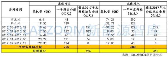 自2015年3月以后并網(wǎng)的光伏和風(fēng)電等可再生能源項目還未被納入到國家可再生能源補貼目錄內(nèi),這一范圍內(nèi)的可再生能源項目補貼皆被拖延,記者根據(jù)補貼被拖延項目的并網(wǎng)時間和裝機量來估算截至2017年末中國可再生能源補貼缺口。經(jīng)測算,截止2017年末,光伏項目可再生能源補貼拖欠金額已高達496億元,風(fēng)電項目可再生能源補貼缺口金額已高達351億元。