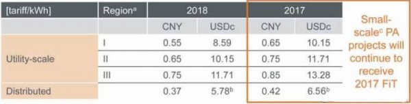 在以上新增裝機(jī)中,除了領(lǐng)跑者計(jì)劃實(shí)行競標(biāo)以外,其他光伏項(xiàng)目均以標(biāo)桿電價(jià)(feed-in-tariff)方式實(shí)施。如下表所示,盡管中國的光伏標(biāo)桿電價(jià)數(shù)度下調(diào),但是大型地面光伏的標(biāo)桿電價(jià)依然高于10美分/千瓦時(shí),數(shù)倍于近來國際光伏競標(biāo)價(jià)格。所以,國外業(yè)界有觀點(diǎn)認(rèn)為中國的光伏大躍進(jìn)是高額補(bǔ)貼出來的。