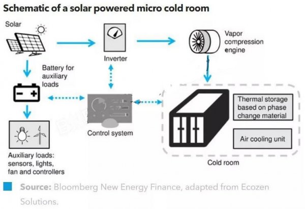 冷藏需求開始不斷為偏遠地區(qū)的微電網(wǎng)創(chuàng)造新的機會,有望為微電網(wǎng)帶來重要的潛在收入。由于缺乏冷鏈基礎(chǔ)設(shè)施,許多新興市場中的農(nóng)產(chǎn)品會在收獲后面臨嚴重損失,僅印度一國在這方面的損失就超過約140億美元。在冷藏需求無法滿足、電力供應(yīng)不足,及光伏電力具備價格優(yōu)勢的大環(huán)境下,一些下游光伏運營商可能會迎來新的機會。