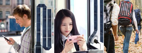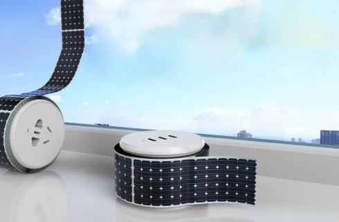 用超薄的柔性太陽能電池板,像封箱帶一樣繞成一卷,末端是一個圓形的插座,于是,需要的時候,我們可以非常方便地將電池板拉出來鋪在地上、纏在帳篷上,瞬間就能誕生一個不錯的太陽能發(fā)電站。
