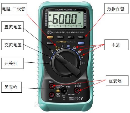 (1)直流電壓的測量,如電池、隨身聽電源等。首先將黑表筆插進“COM”孔,紅表筆插進“V Ω”。把旋鈕選到比估計值大的量程 (注意:表盤上的數(shù)值均為最大量程,“V-”表示直流電壓檔,“V~”表示交流電壓檔),接著把表筆接電源或電池兩端;保持接觸穩(wěn)定。數(shù)值可以直接從顯示屏上讀取,若顯示為“1”,則表明量程太小,那么就要加大量程后再測量。如果在數(shù)值左邊出現(xiàn)“—”,則表明表筆極性與實際電源極性相反,此時紅表筆接的是負(fù)極。