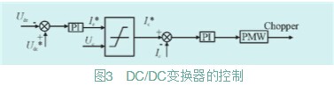 雙向DC/DC變換器實現(xiàn)直流低壓側(cè)超級電容器組與直流高壓側(cè)之間的能量轉(zhuǎn)換。DC/DC變換器的控制目標不能簡單設定為維持儲能電容器直流高壓側(cè)電壓恒定,同時還須滿足超級電容器的功率限制,其控制框圖如圖3所示。